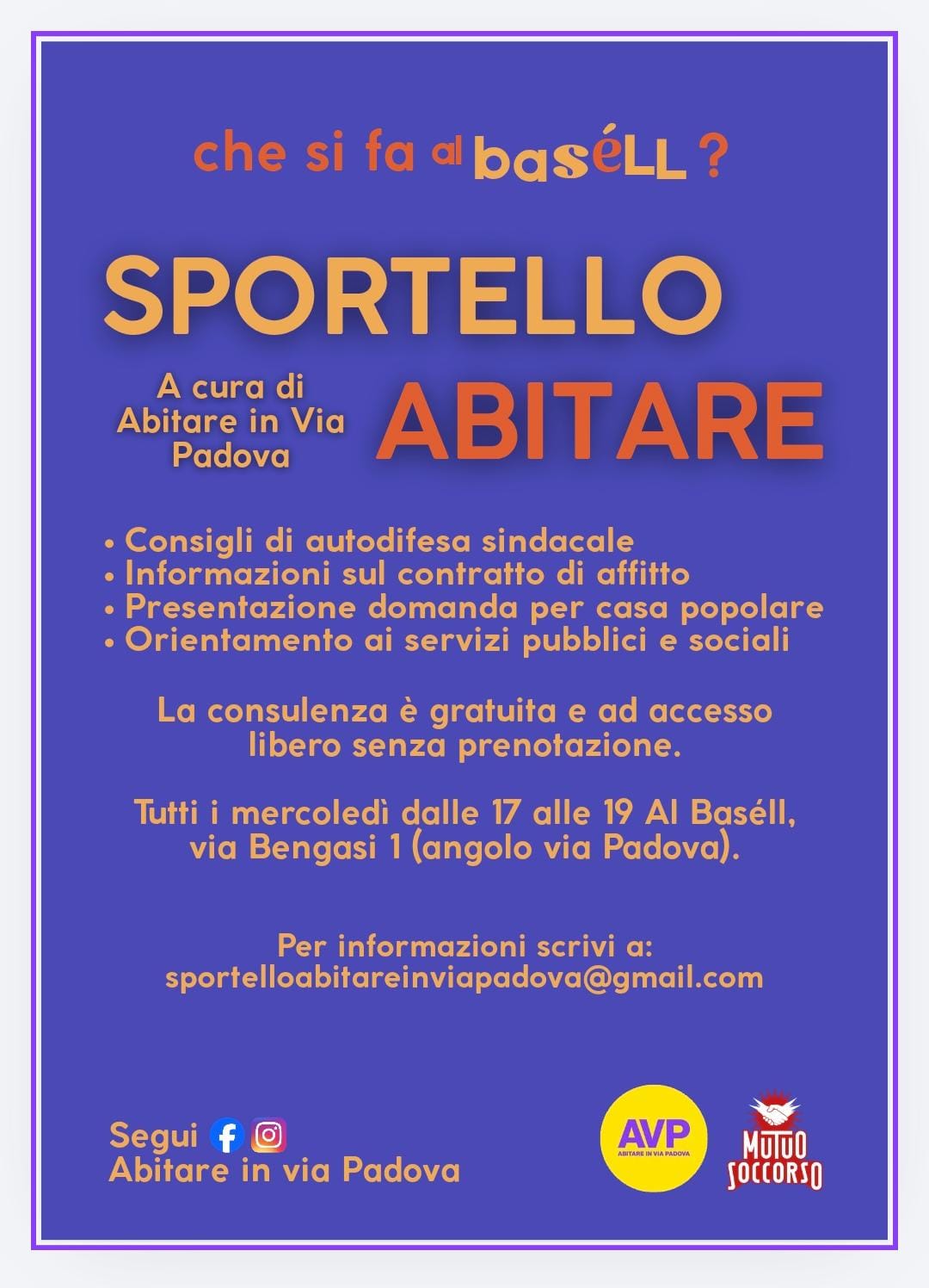 Consigli di autodifesa sindacale, informazioni sul contratto di affitto, presentazione domanda per la casa popolare, orientamento ai servizi pubblici e sociali. Per informazioni: sportelloabitareinviapadova@gmail.com. Vi aspettiamo!