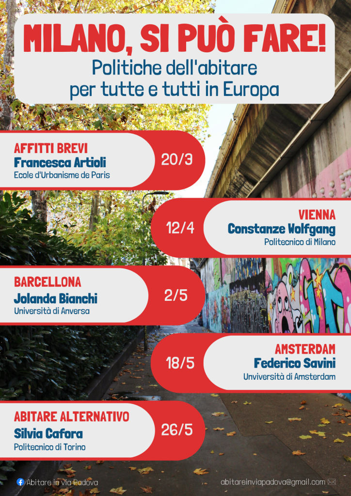 Con questo ciclo di incontri aperto a tutte e tutti Abitare in Via Padova vuole condividere quanto si realizza in altre città europee per pensare un’agenda dell’abitare per tutte e per tutti per il nostro quartiere, per la città e la sua area metropolitana.
