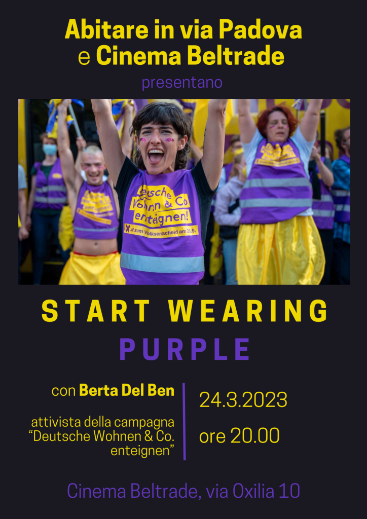 Venerdì 24 marzo alle 20.00 presentiamo al Cinema Beltrade “Start wearing purple”, un documentario che racconta la storia del movimento nato dal basso per promuovere il referendum sulla casa a Berlino nel 2021 e le sue modalità di resistenza quotidiana: partire dal microcosmo di una città per guardare ai grandi problemi strutturali della società e innescare così un desiderio di cambiamento.