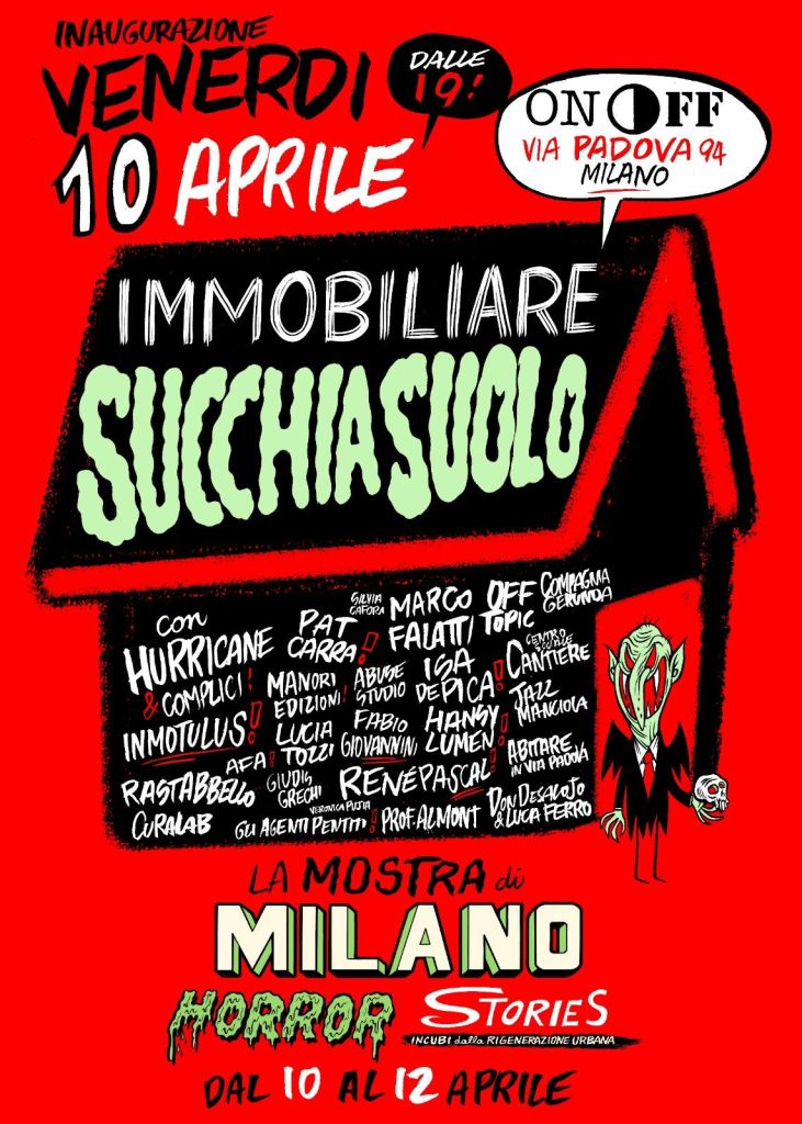 Vi aspettiamo questo venerdi 10 aprile da On/Off (Via Padova 94 a Milano) per l’apertura della vorace IMMOBILIARE SUCCHIASUOLO. Che è una vera agenzia di vampiri della Rigenerazione Urbana, ma anche la prima mostra ufficiale di “Milano Horror Stories” , con un cast stellare di visionarie e visionari: DePica Isa , Pat Carra , Hurricane Ivan Marco Falatti, Lucia Tozzi, Giacomo Rasta Bello, Adriano Pasquali Inmotulus, il vampirologo Fabio Giovannini (Ivo Scanner), Hansy Lumen, Prof. Almont.