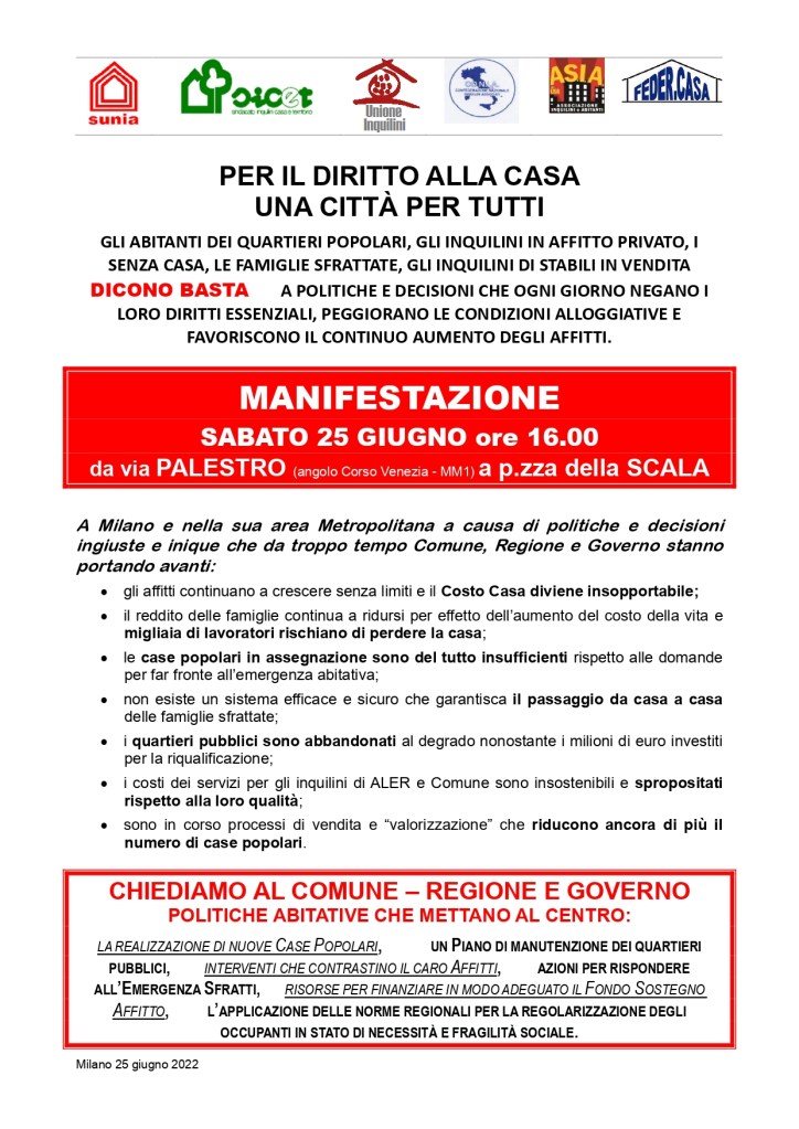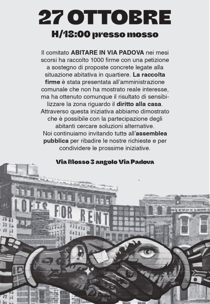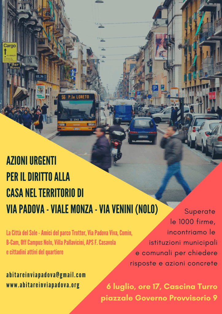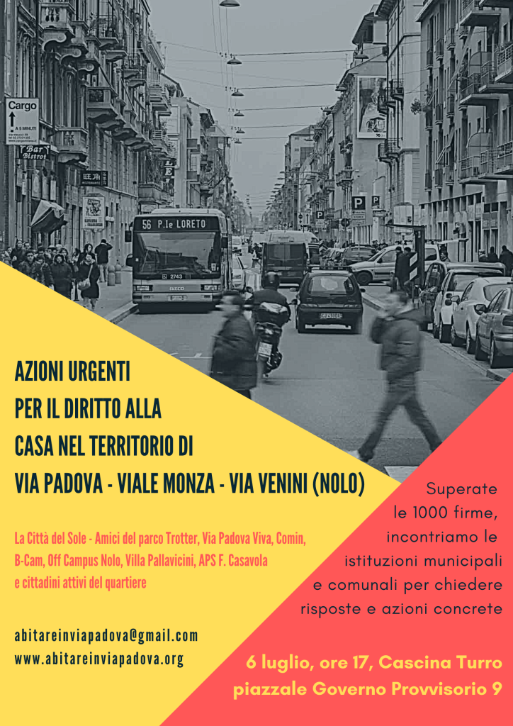 Il 4 febbraio Abitare in via Padova organizza in quartiere una passeggiata per il diritto alla casa, a cui tutte le associazioni impegnate sul tema dell’abitare, tutte le abitanti e gli abitanti di via Padova e dintorni sono invitati a partecipare.