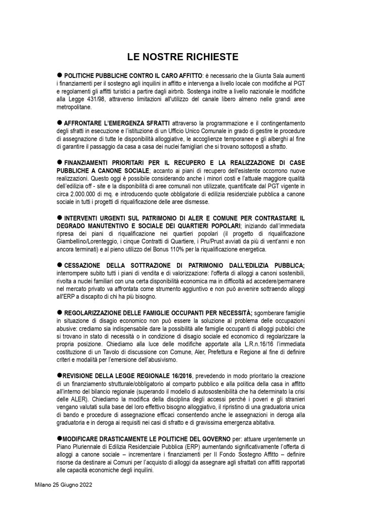 Questa iniziativa, che segue la petizione del giugno scorso in cui sono state raccolte più di 1000 firme, si pone come obiettivo quello di smuovere le acque per costringere i decisori politici ad affrontare il tema della casa, chiamando le istituzioni ad un confronto schietto sulle nostre proposte (dopo che per più di un anno sono state ignorate), al fine di stimolare il dibattito pubblico e far partire politiche abitative degne di una città europea.