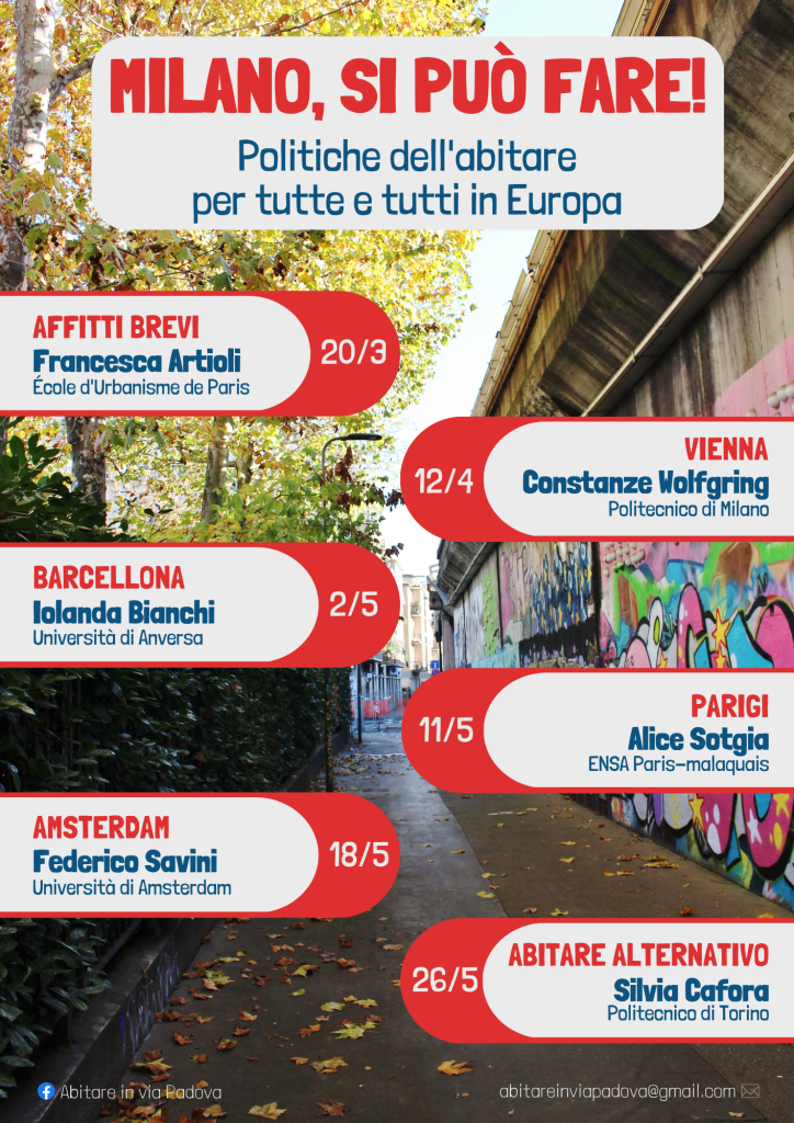 Con questo ciclo di incontri aperto a tutte e tutti Abitare in Via Padova vuole condividere quanto si realizza in altre città europee per pensare un’agenda dell’abitare per tutte e per tutti per il nostro quartiere, per la città e la sua area metropolitana.