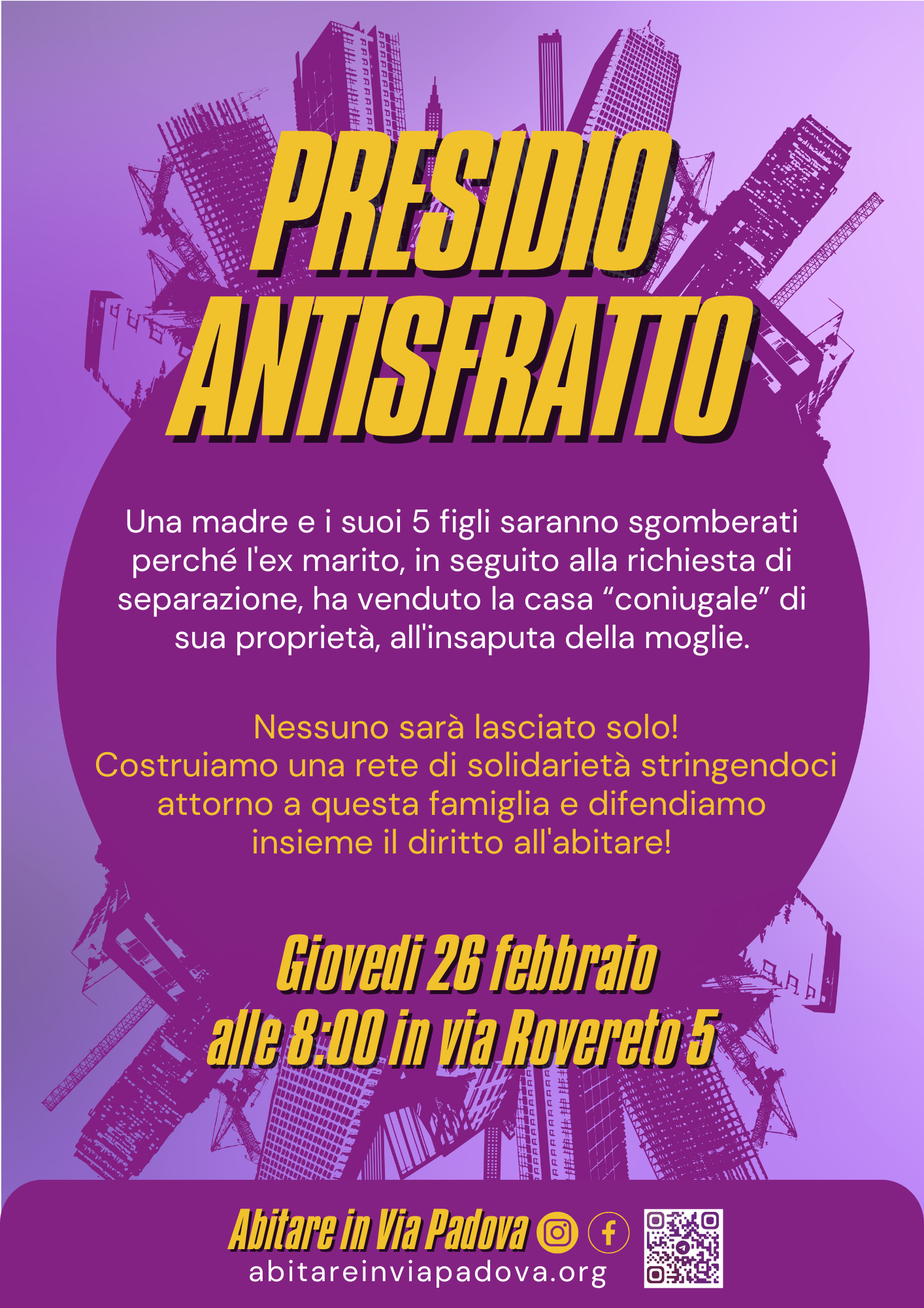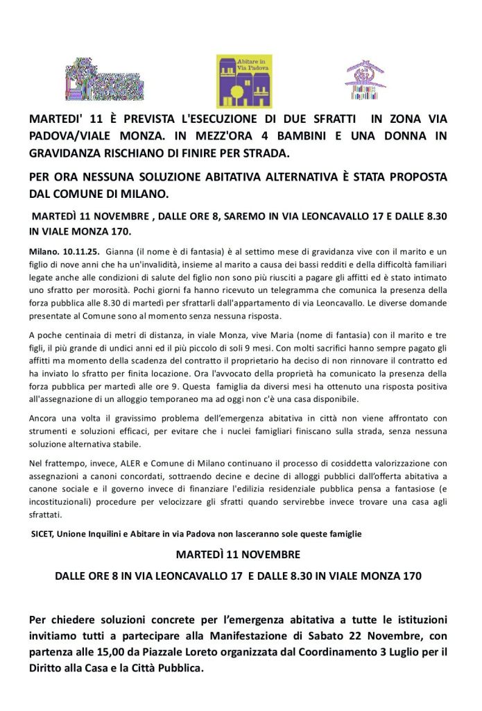 L’11 novembre con Abitare in Via Padova, Mutuo Soccorso Milano APS, Centro Occupato Autogestito T28, Unione Inquilini Milano e Sicet Milano saremo impegnat* in due presidi antisfratto in Municipio 2, tra viale Monza e via Leoncavallo grazie alla rete cittadina nata dopo un lavoro di diversi anni che ha unito il lavoro fatto dai sindacati nei quartieri con quello della Rete per il diritto all’abitare e la campagna Chiediamo Casa. Con il Movimento 3 luglio e l’iniziativa di domani proviamo a resistere cercando soluzioni abitative per due famiglie del quartiere in avvicinamento alla manifestazione cittadina per il diritto alla casa e alla città del 22 novembre. Chiediamo casa e una città per tutt*! Basta sfratti e sgomberi. Un’altra città è possibile!